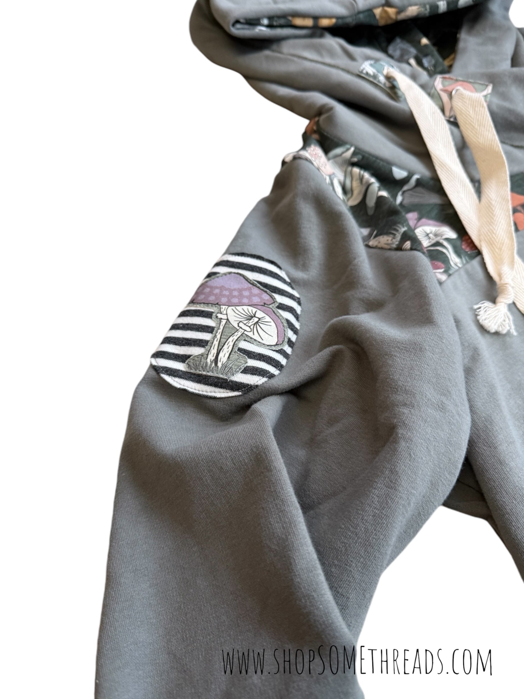 The front is a giant pocket with a hand drawn mushroom appliqué.