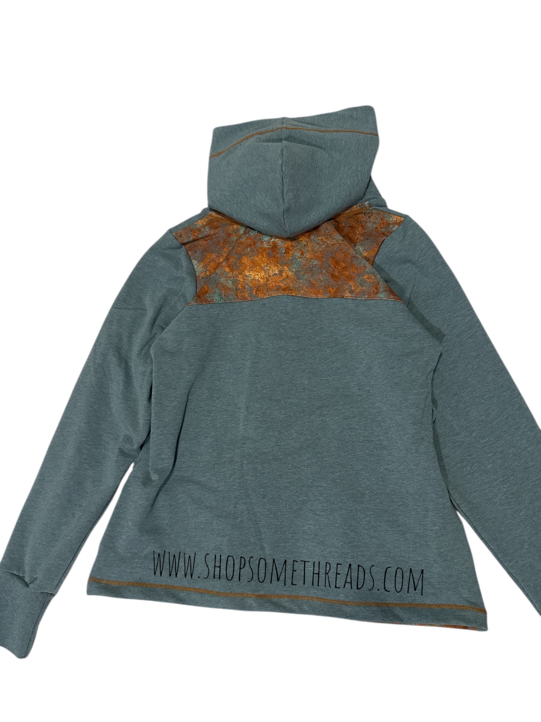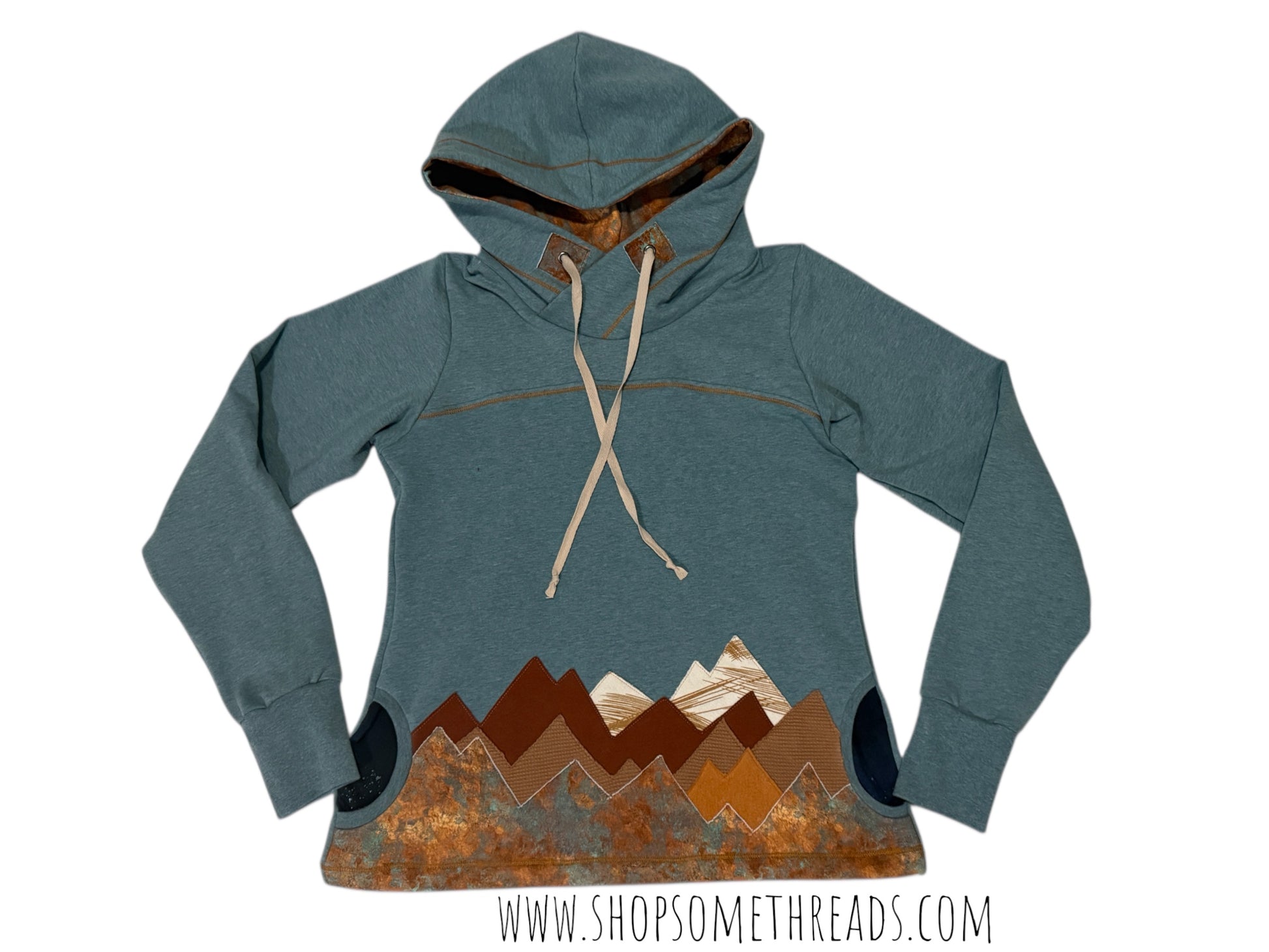 a gorgeous mountain appliqué adorns the front pocket of this hoodie.