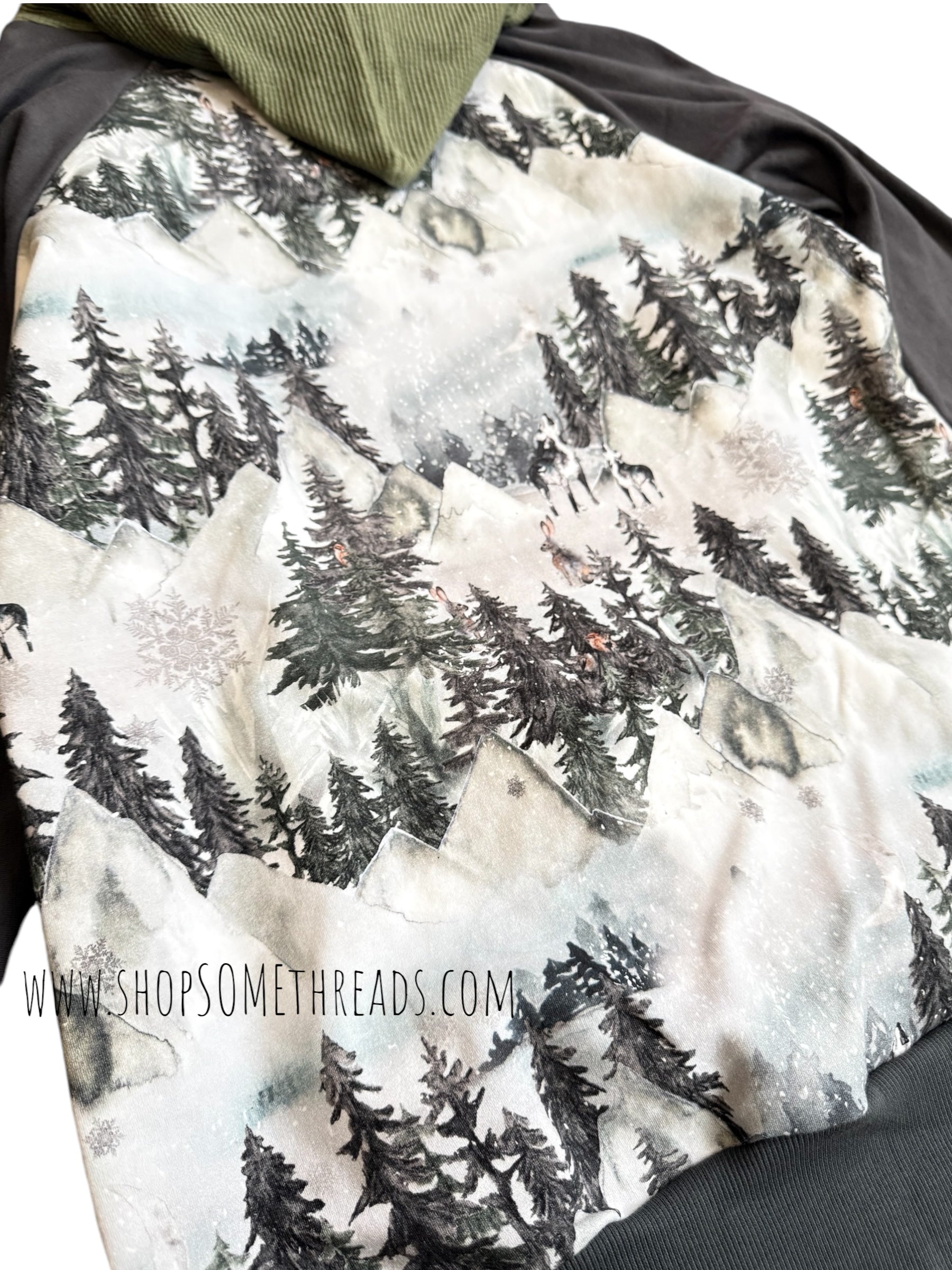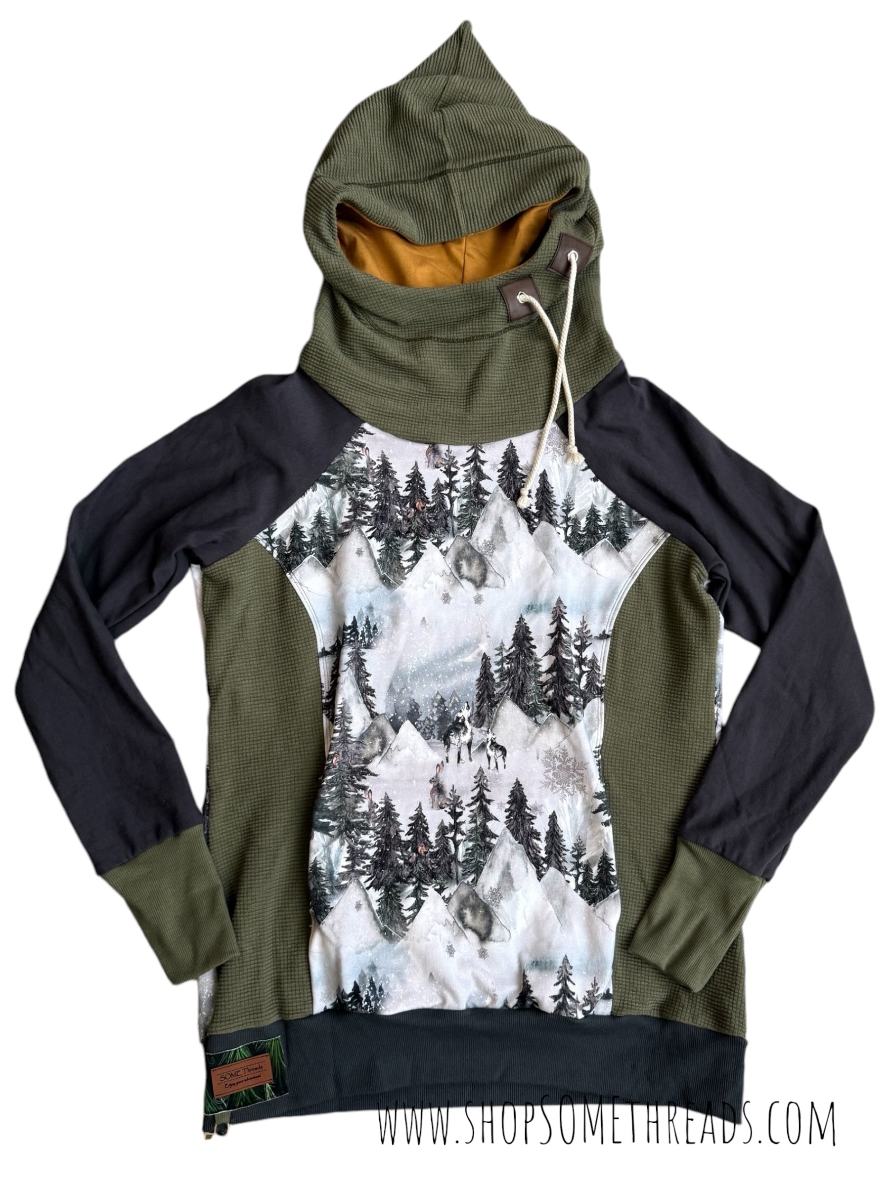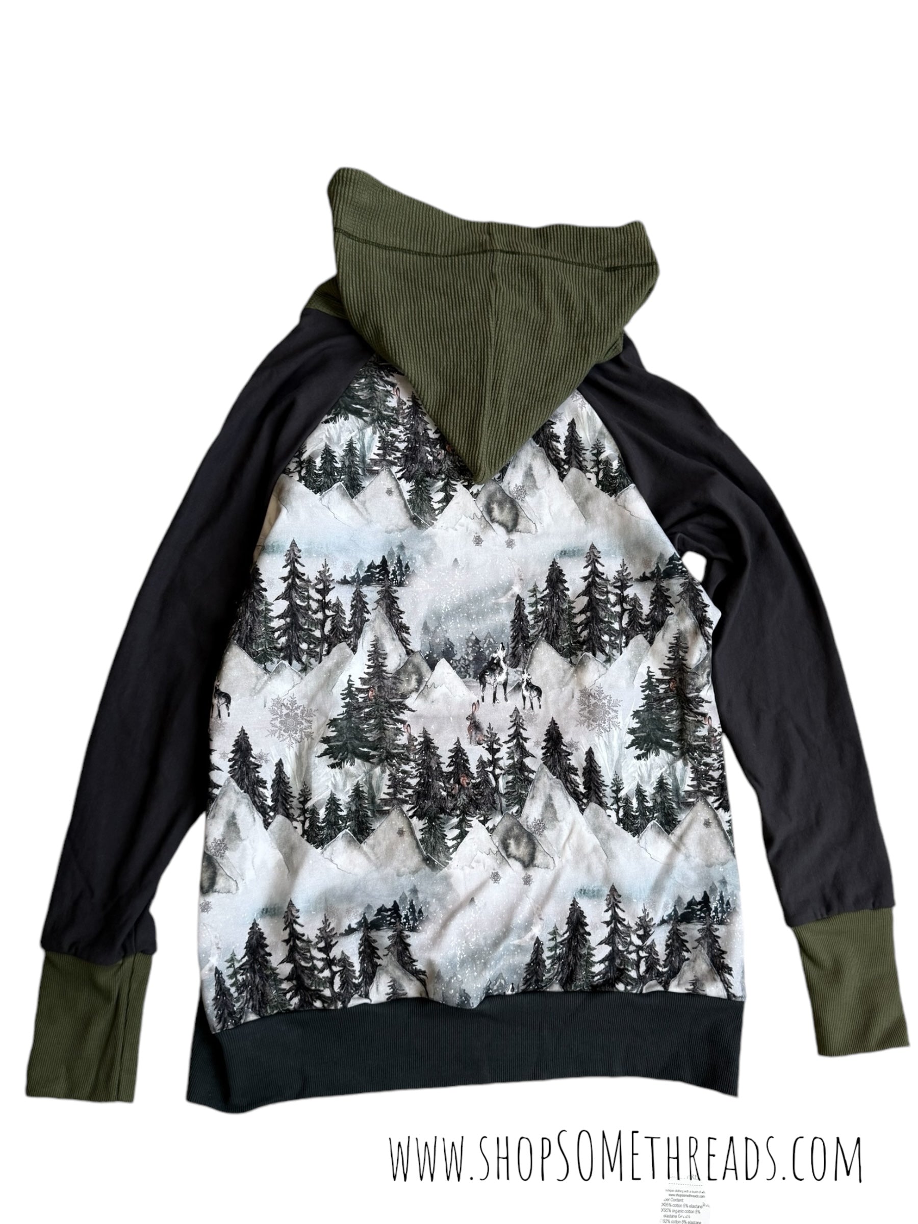 Winter woods are magical and so is this hoodie. With a hand warming pocket and cowl-hood.